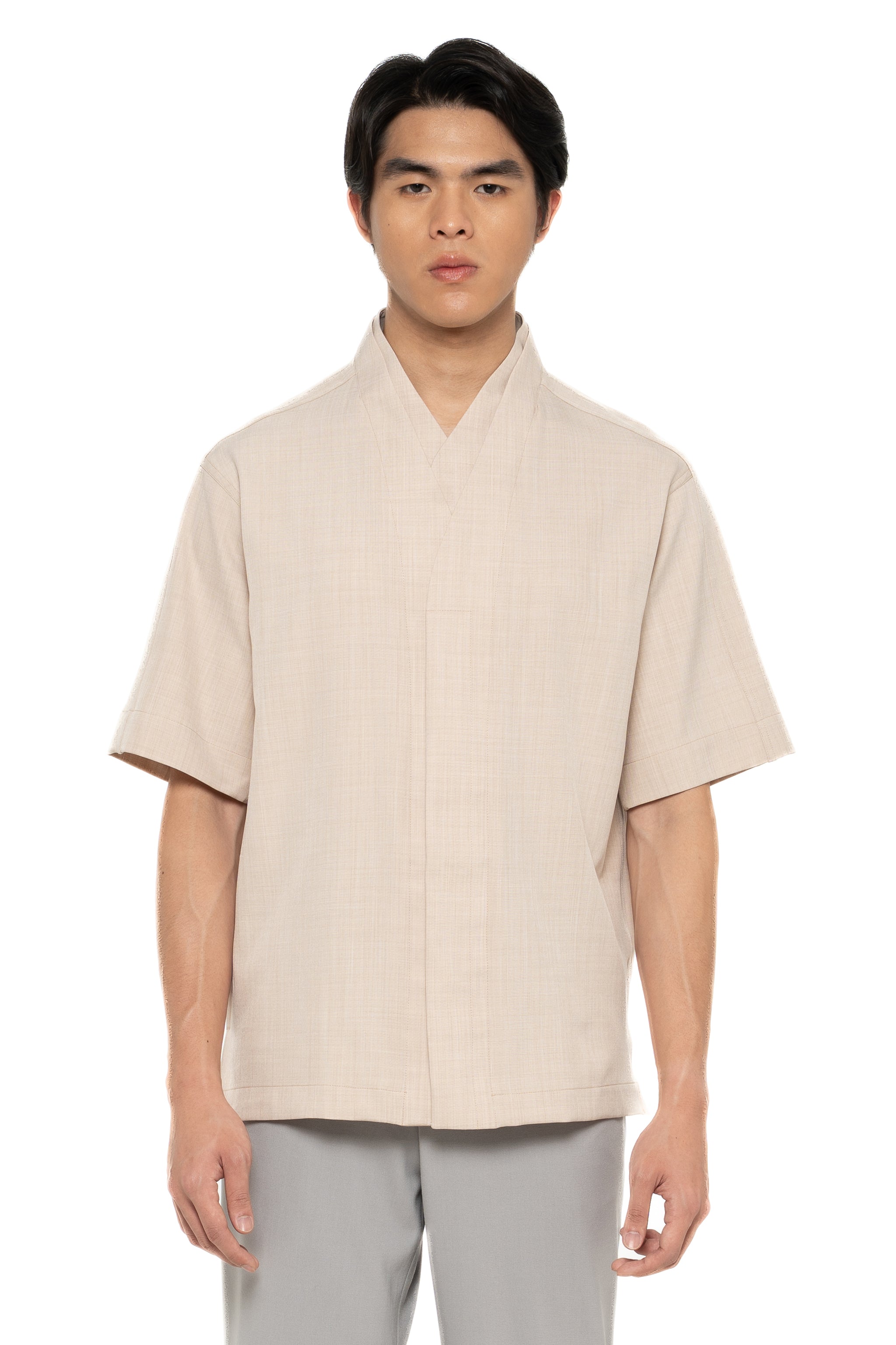 BEIGE DOUBLE LOOSE COLLARLESS PART 5 SHORT SLEEVES SHIRT